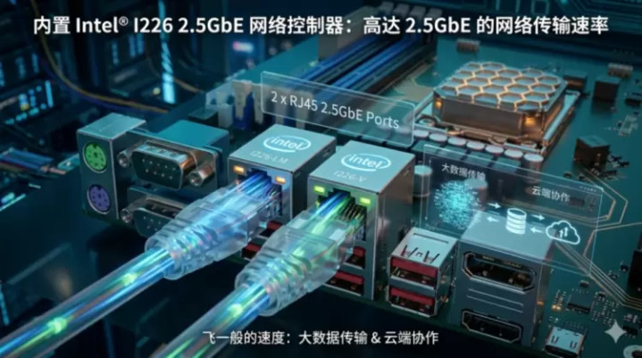 内置Intel®I226-LM和I226-V2.5GbE汇集戒指器,提供两个RJ45汇集端口,已毕高达2.5GbE的汇集传输速率。岂论是大数据传输依然云表互助,皆能享受飞一般的速率。